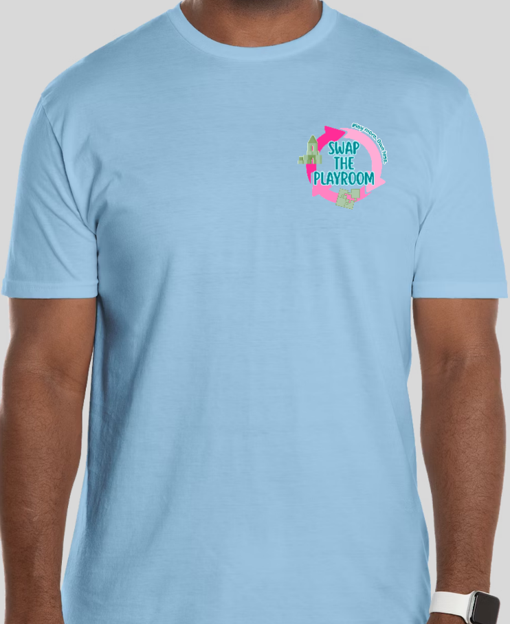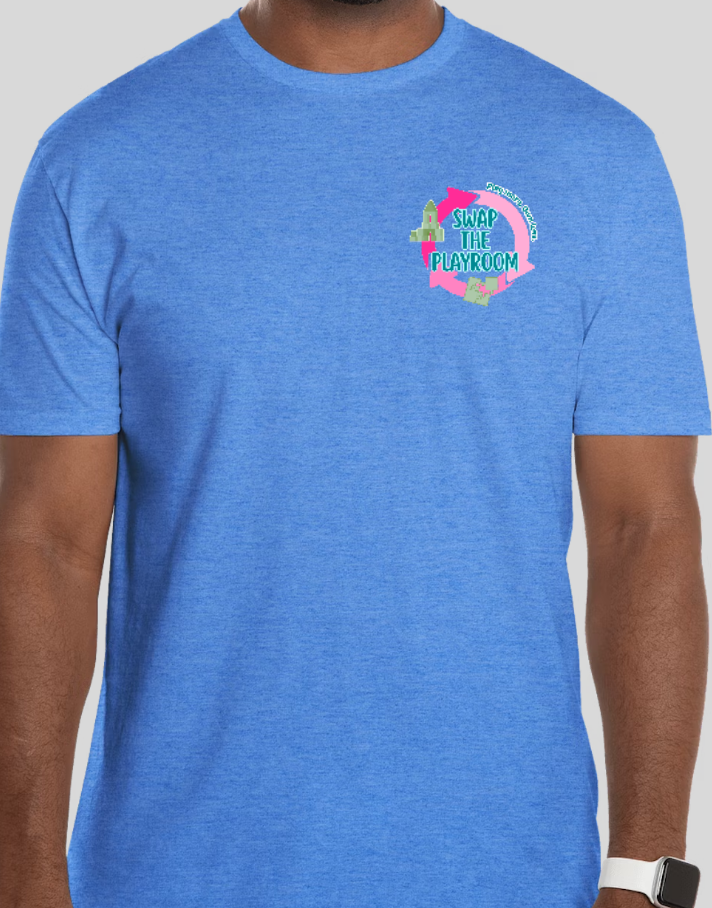 GILDAN Dry Blend (50/50).  Available in Heather Royal, Light Blue and White